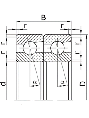Подшипники шариковые радиально-упорные сдвоенные, наружные кольца обращены друг к другу разноименными торцами, угол контакта α=36º